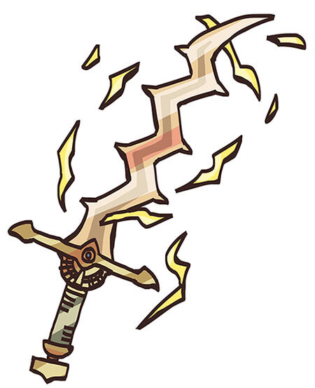 A magical sword forged in a way to resemble a lightning bolt. Its uncanny appearance makes it seem like an inefficient weapon to wield yet in the tactician's hands, it's anything but.It allows Robin to channel lightning magic into her attacks.She took it from Gangrel after defeating him at the Border Wastes. Like her grimoire, Robin looks after this blade with much care.